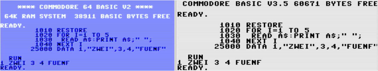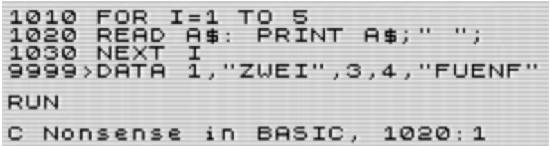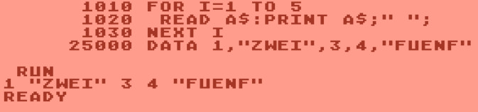 Nun war meine Neugier geweckt, und ich probierte es in unterschiedlichen Emulationen aus. Im Atari-Basic, erinnerte ich mich, werden in DATA-Zeilen Zeichenketten nicht in Anführungszeichen gesetzt, das Basic kann sie selbständig von numerischen Variablen unterscheiden. Verwendet man dennoch Gänsefüßchen, werden sie Bestandteil der Variablen.