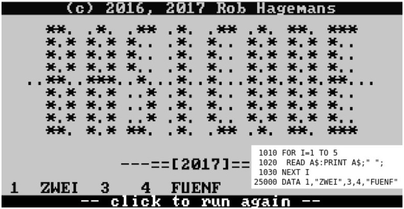 Ein Computerfreund wandte sich unlängst mit einer Frage an mich. In einem Programm sollten auch numerische Daten als Strings eingelesen werden, was nach den BasiCode-Vereinbarungen nicht zugelassen ist, bei READ A$ MUSS an der betreffenden Stelle in den DATAs eine Stringvariable stehen, bei READ A eine numerische. Unter dem Java-Bascoder von Jens Müller wurde dementsprechend auch mit einer Fehlermeldung abgebrochen. Ich testete die Situation als erstes im online-Browser von Rob Hagemans – doch dort funktionierte es, ohne einen Fehler zu melden: