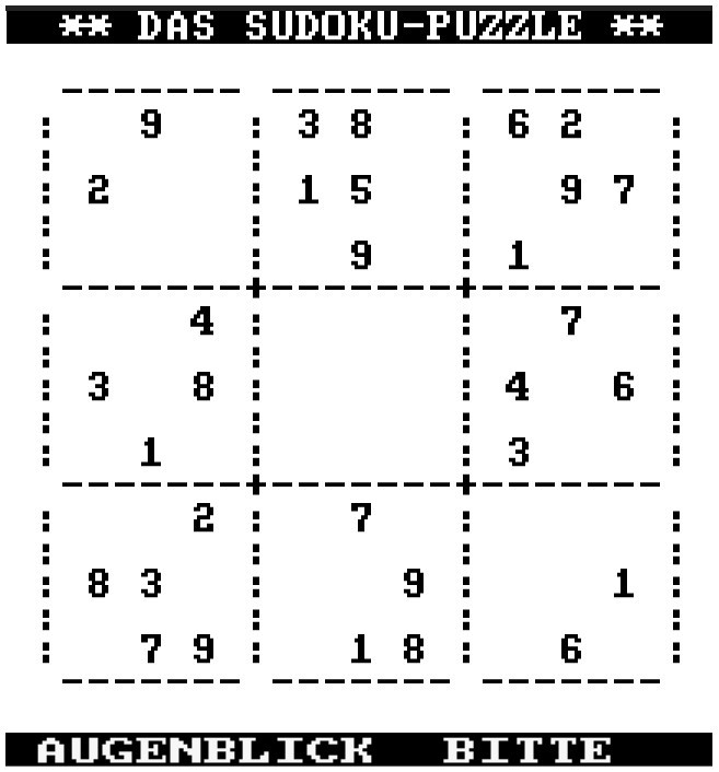 Vor einigen Jahren passte ich ein ZX81-Programm an unsere Joyce an. Weil mich diese Sudoku-Version nach wie vor begeistert, habe ich sie nun auch für BasiCode (also für verschiedenste Computer) nutzbar gemacht. Nebenbei beseitigte ich einen kleinen Ausgabefehler, der in bestimmten Situationen auftrat. Neu hinzugekommen ist die Möglichkeit, den Spielfeldrand zu übertreten, um auf der gegenüberliegenden Seite wieder hereinzukommen. Zu guter Letzt sind am Ende noch weitere Rätsel vorgegeben, sie können jeweils anstelle des Beispiels am Programmanfang eingesetzt werden. Die reine Joyce-Version hat die Änderungen ebenfalls bekommen, das Listing der BasiCodeVersion (die unvermeidlich langsamer ist), kann der geneigte Leser HIER aufrufen.