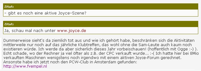 Werner hatte auch schon Anfragen an den Programmierer geschickt, die unbeantwortet blieben. Das hat allerdings einen merkwürdigen Beigeschmack, hatte dieser doch gemeint, in einem Internetforum seine Einschätzung verbreiten zu müssen, beim JOYCE-Klub sei außer den Klubtreffen wohl nicht mehr viel Aktivität vorhanden. Jedenfalls wäre es kein Problem, ihm einen echten JOYCE (und sogar dauerhaft) zur Verfügung zu stellen, sowohl Werner als auch Lothar haben genügend davon in Reserve stehen.