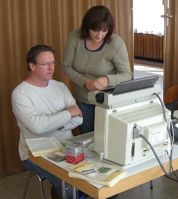 Das diesjährige Treffen in Nothfelden wurde überschattet vom Tod unseres SPC Gründers Wolfgang Haller, welcher am 23.8. an den Folgen einer Hirnblutung verstorben war. Ich war mit meiner Freundin Andrea angereist, diesmal besser vorbereitet als beim Wittenberger Treffen (21. + 22.8.2010), hatte einen Fernseher mit mehreren Eingängen, den SAM Coupe, ZX Spectrums, einen Joyce im Rohaufbau, und ein Notebook mitgenommen. Während Andrea beim Spiel Space Invaders erneut den Highscore hochschraubte, vertiefte ich mich in die verschiedenen Rechner, ich wollte vor allem sicherstellen, daß alle Computer noch funktionieren, und der Fernseher mit seinem Videoeingang mit den Geräten gut zusammenarbeitet. Mittendrin dann eine tolle Überraschung !Lothar Möckel, langjähriges (ewiges?) Mitglied beim Joyce Club, hatte für mich einen Joyce als Geschenk mitgebracht! Er hatte das Gerät regelrecht plug and play fähig gemacht, man musste nur noch den Drucker und Tastatur zusammenstecken und einschalten, sogar Bootdisketten und Farbbänder für den Joyce Drucker waren dabei! Ein dickes Dankeschön an Lothar, ich hab mich sehr gefreut !! Wir waren mit ca 15 Personen in Nothfelden, tagsüber wurde mit Joyce, Spectrum und anderen 8-bittern gewerkelt, und am Samstagabend gings in ein Restaurant in Wolfhagen. Danach wurde ein Film gezeigt "Peng- du bist tot!" mit Ingolf Lück und Rebecca Pauly. Der Film ist für uns vor allem wegen dem Roboter (Max?) sehenswert, der von einem ZX Spectrum gesteuert wird! Die jährliche Mitgliederversammlung der Joyce AG fand ebenfalls statt. Die Mitglieder wissen das :-) Für mich war das Wiedersehen mit den Joyce und Spectrum Freunden wieder richtig gelungen, ich hab mich über den Joyce sehr gefreut, den werde ich in den kommenden Wochen bestimmt gut erforschen! Viele Grüße von Dieter Hucke ! |