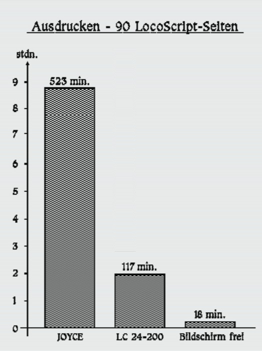 Schneller geht es nicht mehr ... Mit den richtigen Erweiterungen kann der JOYCE wahre Wunder vollbringen und stellt mit seinen Leistungsmöglichkeiten manchen PC (der damaligen Zeit) in den Schatten. So ist es mir gelungen, einen 50 Seiten langen LocoScript-Text in 21 Minuten und 56 Sekunden zu Papier zu bringen !!! Das ergibt eine Druckleistung von 27 Sekunden pro DinA 4 Seite (Nachtrag: Im Zeitalter der Laserdrucker kaum noch vorstellbar). Diese Superleistung vollbringt (m)ein JOYCE PCW 8512 mit Sprinter und SpeedPrint Schnittstelle, an der ein EPSON Stylus 800+ Tintenstrahldrucker angeschlossen ist, unter der Verwendung von LocoScript 3. Mittels LocoScript 3 wurde auch dieser Beitrag erstellt. Die hier dargestellten Diagramme wurden mit dem MicroDesign Tabellenprogramm MicroCHART erstellt.