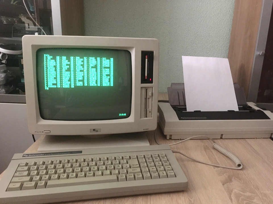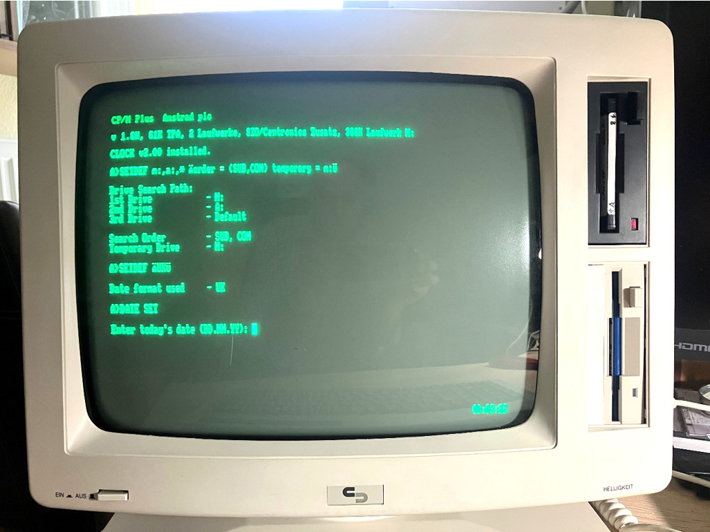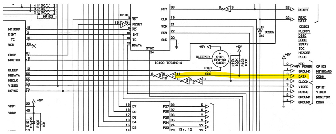 Auch sollte der Rechner um ein 3,5" B-Laufwerk erweitert und der RAM-Speichers auf 512K aufgerüstet werden. Leider hat die Joyce nach dem Booten auf keinen Tastendruck reagiert ! Bei der Eingabe des Datums war erstmal Schluss ! Nach dem ich die Prozessorplatine zugänglich gemacht habe, schaute ich mir an, über welchen Weg die Tastatursignale in den Rechner gelangen. Das Keyboard wird extern über einen 4poligen DIN-Stecker am Gehäuse verbunden. Von dem DIN- Stecker führen vier Drähte zu dem Stecker CP103 auf dem CPU P.C.Board. Eine Messung ergab, dass von der Tastatur Signale bis zu diesem Stecker gesendet, jedoch nicht bis zum CP/M weitergeleitet wurden. Auf der Schaltung erkennt man, dass die Signale vom Keyboard über den Stecker 103, Pin 3 (DATA) zum IC120 Pin 11 führen. Das IC120 ist ein 74HC14 Schmitt Inverter. Eine weitere Messung am Pin 11 ergab weiterhin; die Signale kommen an. Jedoch am Pin 10, dem Ausgang des Schmitt Inverters kam nichts mehr heraus. Der Baustein TC74HC14P beinhaltet 6 Schmitt Inverter, von denen zwei für das Tastatursignal genutzt werden: Pin 11 nach PIN 10 und Pin 9 nach PIN 8. Ab dem Pin 10 war keinerlei Signal zu messen. Somit habe ich einen neuen Baustein besorgt, das defekte IC ausgelötet, einen Sockel verlötet und das neue IC eingesteckt. Auf dem Foto sieht man auch die RAM Erweiterung auf 512K in der oberen Reihe und die korrekt um gelötete Brücke LK1 dazu. Jetzt ist der Rechner wieder voll einsatztauglich und nun auch mit 512K und einem 3,5" Laufwerk B.