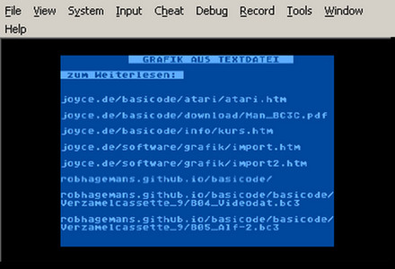 Zwar hatte ich bisher nicht BasiCode dafür verwendet, obwohl die beiden Sachen dem gleichen Grundgedanken folgen - aber jetzt war mal die Zeit reif dafür. Die BasiCode-Festlegungen verbieten maschinenspezifische Sachen (wie das POKEn in Speicherbereiche) nicht von vornherein, halten jedoch dazu an, sie in einem bestimmten Zeilenbereich (20000-24999) unterzubringen und in REM-Zeilen ausführlich zu erklären, damit User anderer Computer dort ihre entsprechenden Routinen erstellen können. So muss ich mich nicht erst in ein anderes Basic hineinfuchsen, sondern kann in einer mir vertrauten Umgebung arbeiten. Es gelang auch recht gut und Andreas stellte es im ABBUC-Forum vor, von dort hagelte es aber Hinweise, das HRT-Format sei nicht stark verbreitet ... das will ich gar nicht abstreiten ;-) ... und es gäbe doch schon Lösungen, Grafiken in Text-Verschlüsselung zwischen unterschiedlichen Computern auszutauschen. Solche Antworten buche ich aber unter der Rubrik "Mit Kanonen auf Spatzen schießen" ab, es geht hier um Sachen auf viel ressourcenreicheren PCs, ein einziges Pixel wird schon mit mehreren Buchstaben verschlüsselt. Kriegt man so ein Instrumentarium in einem 8-bit-Computer und auf 180- oder 360-KB-Disketten unter?