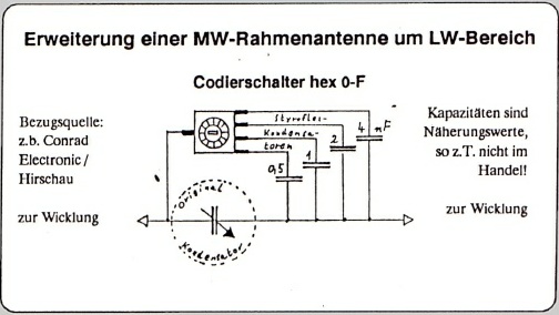 War man - nach etwas über einer Woche - im Besitz der gefüllten Scheibe, so stand dem Empfang diverser Spiele, Lernprogramme, Hilfsprogramme für Amateurfunker und DX-er, einer Kontaktbörse sowie einer Bildschirmzeitung zu den Themen Raumfahrt, Stereophonie, Elektronik und Computer eigentlich nichts mehr im Wege. Blieben nur noch der Empfänger und die Antenne. Bewohnern sogenannter "Arbeiterschließfächer" blieb BASICODE leider verwehrt, da faraday'sche Käfige gemeinhin für elektromagnetische Wellen ziemlich undurchlässig sind und die Gemeinschaftsantenne praktisch nie die langwelligeren Bänder unterstützt. Ansonsten waren die Anforderungen an das Radio nicht allzu groß, wobei allerdings die - eingebaute oder externe - Antenne eine gewisse Richtwirkung haben sollte, um Interferenzen auf ein Minimum zu reduzieren. So lieferte ein einfaches Kofferradio mit Ferritantenne in der Regel bessere Ergebnisse als ein HighTech-Produkt mit Stabantenne. Diejenigen unter uns, die eine Mittelwellen-Rahmenantenne an ihren Weltempfänger angeschlossen hatten, konnten diese mit einem Styroflex-Kondensatoren und einem Codierschalter (hex 0 bis FF) auf den Langwellenbereich, in dem auch DS-Kultur sendete, erweitern (siehe Schaltbild). Zwar sank hierdurch in dem erweiterten Bereich (von etwa 150 bis 520 kHz) die Güte gemäß der Formel