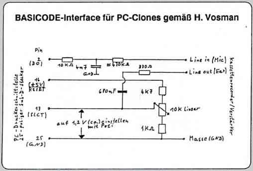 Anfang der 90er Jahre bot der Fernsehsender Pro‑7 einen Programmservice für Computerfreunde. Die Programme wurden auf ähnliche Weise übermittelt wie Videotext auf anderen Kanälen. Der Haken: Zur Decodierung benötigte man ein fast "4 Klaviere" teures Interface, das die chiffrierten Daten entschlüsselt, für Shareware, bei deren Benutzung man ohnehin einen zusätzlichen Obolus zu entrichten hat, ein stolzer Preis. Dass Datenfernübertragung über Massenmedien auch weniger kommerziell ablaufen kann, war Aufgabe dieses 1992 von Thomas Mäurer verfassten Artikels. Die Rede ist hier von BASICODE, speziellen BASIC-Programmen, die auf allen handelsüblichen Rechnern laufen und hierzulande von zwei Sendeanstalten, Radio Hilversum und DS-Kultur, zu drei verschiedenen Sendezeiten im Mittel- und Langwellenbereich zu hören waren. Im Gegensatz zu Pro7 war zum Einspeisen in den Computer bei den meisten Typen nur sehr wenig Hardware erforderlich, die sich zudem leicht selbst zurechtlöten lässt. Atari ST und PC-Clones kamen mit etwas mehr als einem halben Dutzend passiver Bauelemente (Widerstände, Z-Dioden, Potis und Kondensatoren) zurecht, womit die Kosten für das Interface incl. aller Stecker die 10-DM-Grenze kaum überschritten. Die meisten 8-Bitter benötigen nicht einmal ein Interface, da diese die vorhandene Kassettenschnittstelle nutzen konnten (und auch heute noch können). Das Interface war natürlich nur die halbe Miete, wie jede nicht standardmäßig vorgesehene Peripherie braucht auch diese einen "Treiber". Wenngleich nicht alle Treiber sogenannte PD (Public Domain) sind, so liegen doch deren Preise zumindest auf PD-Niveau. Sehr günstig kamen z.Z. Eigner von Computern des selbsternannten "Industriestandards" (PC-Clones) an die erforderliche Systemsoftware: Es genügte eine formatierte Diskette mit schriftlicher Angabe des Formats, der Adresse, der Aufschrift "BASCODER für PC", sowie eine selbstadressierte und ausreichend frankierte Verpackung für die Rücksendung. Dies alles schickte man an: Deutschlandsender-Kultur, "Rem-Spezial Computermaganzin" in Berlin-Ost.