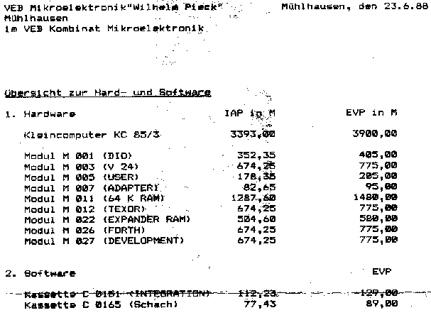 weitere Infos geben. Der KC 85 wurde in Mühl Das Konzept dieser Serie ist von vornherein auf Erweiterbarkeit ausgerichtet, es gibt auch die verschiedensten Steckmodule, einfach mal selbst auf kc-club.de reinschauen. Allerdings war der KC zu DDR-Zeiten nicht unbedingt erschwinglich, als Vergleich zur nachfolgenden Preisliste mal die Information, daß ich als Dreischichtarbeiter in der Mikroelektronik zwischen 1100 und 1300 DDR-Mark netto verdiente.