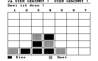 VIERGEWI.ASC, Vier gewinnt gab es schon für BasiCode-2 (ist auf der Kassette zum Wiegand-Fillinger-Buch dabei), diese Version verwendet Pixelgrafik statt damals Buchstaben-Grafik.