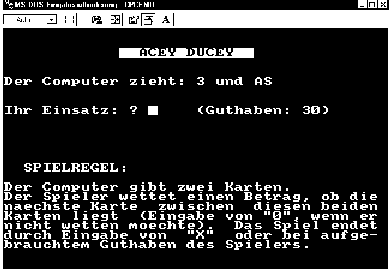 Vor einiger Zeit erhielt ich von Werner N.-B. aus Club-Beständen zwei Bücher mit Basic-Programmen aus der Ära der ASCII-Grafik. Er streitet gar nicht ab, daß er dabei auch ein wenig den Hintergedanken hatte, ich würde das eine oder andere Programm davon für den JOYCE anpassen. Nun bin ich ja derjenige, der so begeistert von den Möglichkeiten von BasiCode ist, so kam ich natürlich auf den Gedanken, dieses oder jenes in das Computer-Esperanto umzusetzen. Doch hier entsteht augenblicklich ein Problem: BasiCode-Programme sind Freeware, und anderer Leute geistige Schöpfung kann ich nicht einfach zur Verbreitung freigeben. Somit blieb mir nichts weiter übrig, als den jeweiligen Spiel-Gedanken selbst in Befehle zu transformieren.