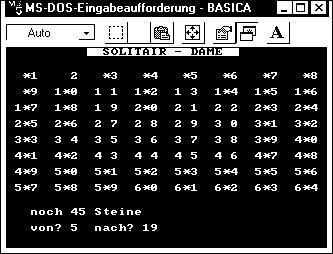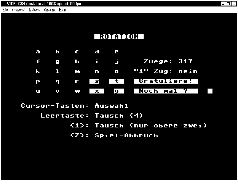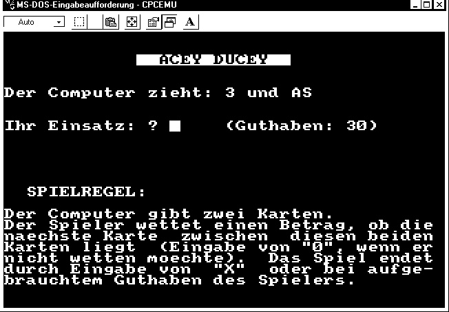 Als erstes nahm ich »Eine Dame« ins Visier, eine Mischung aus Solitair und Dame, die inzwischen als Beispielprogramm (»SOLIDAME.ASC«) auf der BasiCode-Homepage steht. Vielleicht gibt es eines Tages ein Update mit Steuerung per Cursor-Tasten - etwas bequemere Handhabbarkeit möchte man heute doch schon haben ... Manche dieser alten Programme reizen mich gar nicht, obwohl ich die Bücher insgesamt als historisches Objekt interessant finde, manche Ideen existieren schon als BasiCode - Umsetzungen (z.B. Vier gewinnt, Schiffe-versenken, Mastermind, Türme von Hanoi usw.). Nachdem ich etliche Wochen nicht zum Computer-Hobby gekommen war, wählte ich »Acey Ducey« als Übung zum Warmprogrammieren. Dieses kleine Kartenspiel ist wirklich nicht weltbewegend, aber der Effekt, auf den es mir ankommt, ist die Spielbarkeit auf fast allen Heimcomputer-Oldies. Nun konnte ich mich an etwas Anspruchsvolleres wagen und codete »Rotation«, einen Verwandten jenes kleinen Schiebepuzzles aus Plastik - diesmal auch gleich mit Cursor-Steuerung. Um die Nutzbarkeit auf verschiedenen Systemen zu demonstrieren, ist der Text mit Screenshots dieser Spiele vom (emulierten) Commodore 64, vom (ebenfalls emulierten) Schneider/Amstrad CPC und aus einem PC-Basic der frühen Jahre von DOS illustriert.