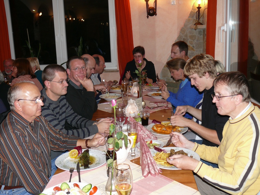 Bevor wir nun zum Abendessen beim Italiener aufbrachen, stellten wir uns noch rasch für das Gruppenfoto auf. Zwar nutzten wir die Selbstauslöser von Dieters und Werners Kameras, trotzdem ist es unvollständig: am nächsten Tag stieß noch Dirk Berghöfer hinzu, der außer mir als einziger das JUAG-Basecap trug. Beim Italiener war es ordentlich voll, gut, daß Werner für uns reserviert hatte. Die Portionen waren riesig und es schmeckte gut.