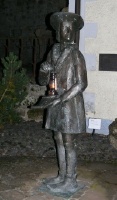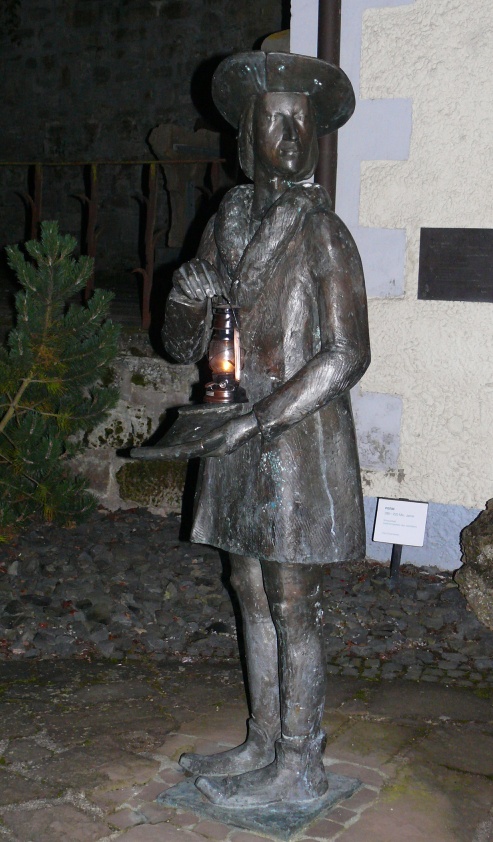 Als Nächstes hatte Werner eine nächtliche Stadtführung für uns gebucht, bei der der Stadtführer als Nachtwächter einschließlich Horn und Hellebarde gekleidet war. Treffpunkt war der Märchenbrunnen auf dem Marktplatz. Wolfhagen vermarktet sich touristisch als Teil der deutschen Märchenstraße und vertritt hier das Märchen von den sieben Geißlein. Außer dem Stadtnamen hat Wolfhagen hierfür vorzuweisen, daß einer der Brüder Grimm einige Jahre hier lebte. Allerdings weder Jakob noch Wilhelm (die die Märchen sammelten und aufschrieben), sondern ein dritter Bruder, der zeichnerisch begabt war und die Märchen illustrierte.