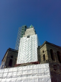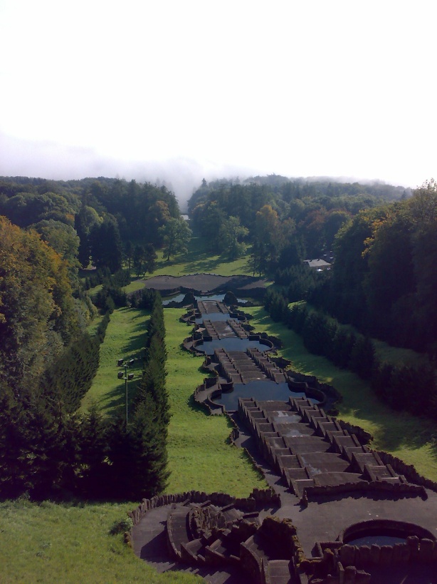 Mit unserem Sohn hatte ich eine Zeit vereinbart, zu der ich mit dem Zusammenpacken beginnen wollte, die Zeit bis dahin nutzten er und meine Frau für eine kurze Visite am Herkules in Kassel. Die Anlage, derzeit wegen Restaurierungsarbeiten größtenteils verhüllt, war beeindruckend, der Blick ins Tal aber an diesem Morgen ebenfalls: von Kassel war nichts zu sehen, es lag alles in dichtem Nebel.