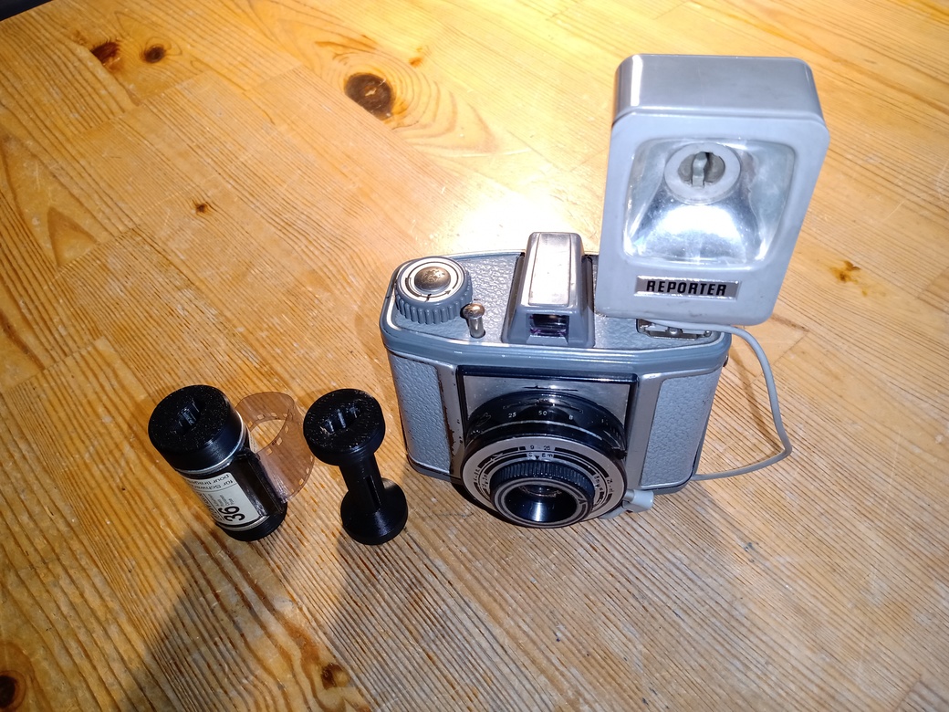 Mit einem Filmadapter (aus der E-Bay) der per 3D-Drucker erzeugt wurde, kann ich 35 mm Kleinbildfilm in diese 60x60-mm-Kamera