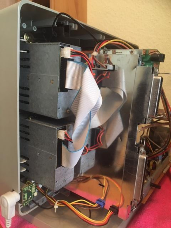 Nach Abnehmen der hinteren Abdeckung sieht man die originalen zwei 3" Diskettenlaufwerke und dahinter