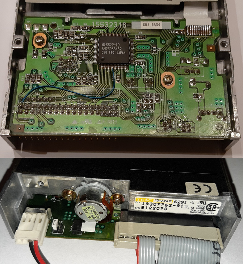 Vorsicht: +5 Volt AnschlußDas von mir in den Joyce eingebaute Laufwerk ist ein NEC 1037A-64: Diese Versionen des Laufwerks muss umgebaut werden, um ein „Ready“-Signal für den Joyce zu erzeugen. Dazu muß ein Draht in das Laufwerk gelötet werden. Über den elektrischen Anschluß des Laufwerks kann man im PCW-Sonderheft 2, S.76ff oder in der Zeitschrift c't (Heft 7/86), sehr fundiert, nachlesen. Ein Hinweis: Der Stecker für die Stromversorgung im Joyce paßt ins Laufwerk — aber Vorsicht: Das Laufwerk braucht auf Pin 1 +5V; der Joyce liefert aber +12V! Das 12V-Kabel muß aus dem Stecker gezogen werden; dorthin kommt das Kabel von Pin 4, das hat die geforderten +5V. Das Laufwerk selber braucht keine 12V-Spannung.