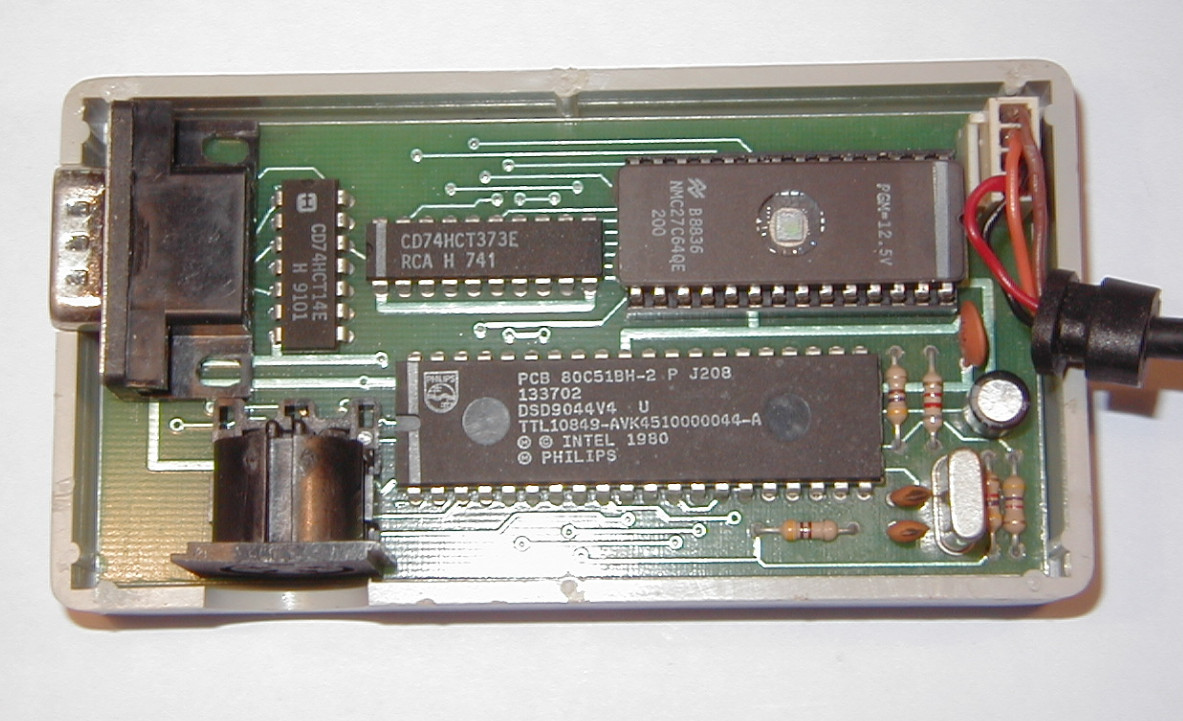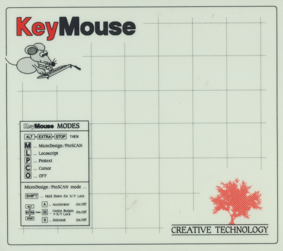 D. Beschreibung der KeyMouse:Die Maus ist eine Maus mit drei Tasten und ist im Grau des Joyce gehalten. Die Maus wird an eine Interface-Box angeschloßen, wie auch die Tastatur. Die Box wird an den Tastatureingang angestöpselt. Ein weitere Expansionsport-Erweiterung (Rückseite des JOYCE) bleibt damit erspart. Die diversen Modi werden über die Tastatur gesteuert mit ALT, EXTRA , STOP und dann wahlweise O, C, P, L, M, A, S und [+]. Die Maus läßt sich leicht rollen, die Tasten klicken leicht und gut fühlbar. Die Kugel kann leicht entnommen und damit gut gereinigt werden, zum Beispiel von Katzenhaaren.
