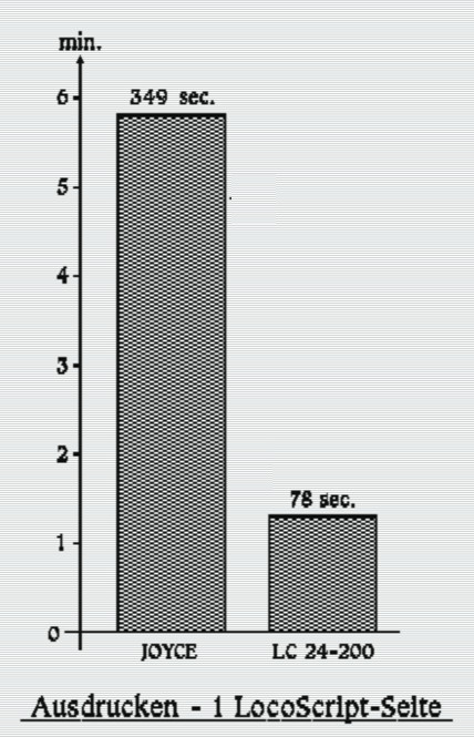 Schneller geht es nicht mehr ... Mit den richtigen Erweiterungen kann der JOYCE wahre Wunder vollbringen und stellt mit seinen Leistungsmöglichkeiten manchen PC (der damaligen Zeit) in den Schatten. So ist es mir gelungen, einen 50 Seiten langen LocoScript-Text in 21 Minuten und 56 Sekunden zu Papier zu bringen !!! Das ergibt eine Druckleistung von 27 Sekunden pro DinA 4 Seite (Nachtrag: Im Zeitalter der Laserdrucker kaum noch vorstellbar). Diese Superleistung vollbringt (m)ein JOYCE PCW 8512 mit Sprinter und SpeedPrint Schnittstelle, an der ein EPSON Stylus 800+ Tintenstrahldrucker angeschlossen ist, unter der Verwendung von LocoScript 3. Mittels LocoScript 3 wurde auch dieser Beitrag erstellt. Die hier dargestellten Diagramme wurden mit dem MicroDesign Tabellenprogramm MicroCHART erstellt.