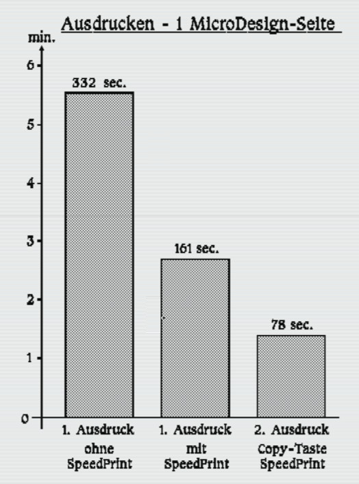 Die SpeedPrint eröffnet neben diesem Zeitgewinn weitere ungeahnte Möglichkeiten: Wer über das Programm Flipper (siehe Mini-Lexikon) verfügt, kann, nachdem der JOYCE die Druckdaten in die SpeedPrint Schnittstelle gesandt hat und der Drucker noch seinen Dienst versieht, nach CP/M flippen (wechseln) und dort z.B. einen Bildschirmschoner aktivieren (siehe Mini-Lexikon). Es ist aber auch möglich, während der Drucker 'unseren' LocoScript-Text zu Papier bringt, LocoScript ganz zu verlassen. Mittels Warmstart, dem sogenannten RESET (gleichzeitiges Drücken der Tasten [Shift] + [EXTRA] + [EXIT] oder Drücken eines RESET-Tasters), kann, ohne den JOYCE auszuschalten, ein anderes Programm geladen werden. So ist es möglich, sich die Zeit während des Druckens durch z.B. ein Spiel (Batman o.ä.) zu verkürzen. Welcher PC ist dazu fähig, während ein anderes Programm noch voll ... Wichtig ist nur, daß der JOYCE nicht ausgeschaltet wird, denn dann wird auch die Stromzufuhr für die SpeedPrint unterbrochen und alle darin gepufferten Daten werden gelöscht. Doch damit noch nicht genug: Die SpeedPrint verfügt über eine COPY-Taste, durch deren Betätigung der in der SpeedPrint gepufferte Text bis zu 65.000 mal neu ausgedruckt werden kann, ohne das der JOYCE dafür in Anspruch genommen werden muß. D.h. auch in der Zeit, in der mehrere Exemplare (Kopien) eines Textes erstellt werden, kann der JOYCE anderwärtig genutzt werden und sei es nur zum Spielen. Ein weiterer Vorteil, der zweite Ausdruck (über die COPY-Taste der SpeedPrint) wird vor allem unter MicroDesign noch schneller. Während eine DinA-4-Seite auf dem STAR LC24-200 ohne SpeedPrint 5 Minuten und 32 Sekunden (= 332 sec) verschlingt, werden nur 2 Minuten und 42 Sekunden (= 161 sec) mit SpeedPrint benötigt - jeder weiterer Ausdruck über die SpeedPrint verkürzt sich auf 1 Minute und 23 Sekunden (= 83 sec. Siehe Diagramm 3).