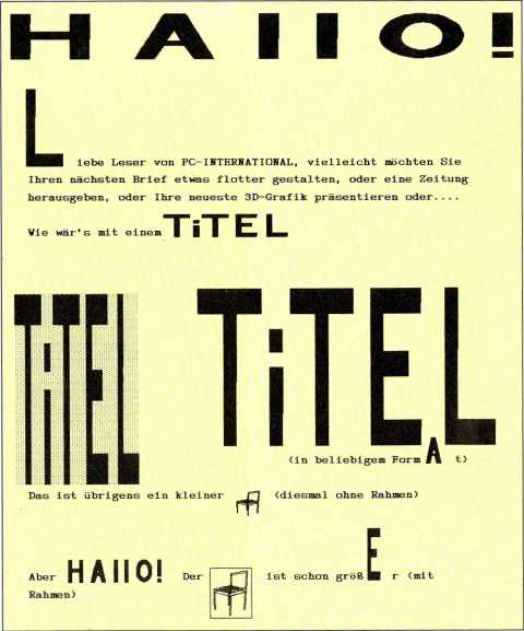 Das neue DruckprogrammIch verspreche nicht zuviel, wenn ich behaupte, daß Sie mit Hilfe dieses Programms schon fast Desk-Top-mäßig arbeiten können. Schauen Sie sich doch nachfolgende Grafik an ... So etwas können Sie von nun an auch kreieren! Bevor es aber ans Eingemachte geht, noch ein Hinweis: