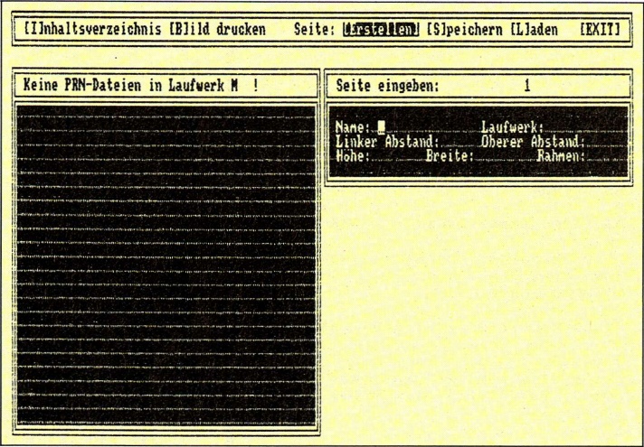 [I] Inhaltsverzeichnis zeigen [B] Bild drucken Dabei werden allerdings Ihre Eingaben gelöscht. Haben Sie sich für's Drucken entschieden, so werden Sie nun aufgefordert, Papier in den Drucker zu legen und [O]k oder [EXIT] zu wählen. Bei [O]k wird gedruckt, bei [EXIT] geht's zurück ins Hauptmenü. Noch ein Wort zum Drucken. Da der Drucker "faul" ist, wird Ihr Bild hier so ausgegeben, daß der Drucker möglichst wenig zu tun hat. Kleine Formate erscheinen also möglichst weit oben und möglichst weit links auf dem Blatt (falls Sie es anders möchten, so schauen Sie ins Menü "Seite erstellen").