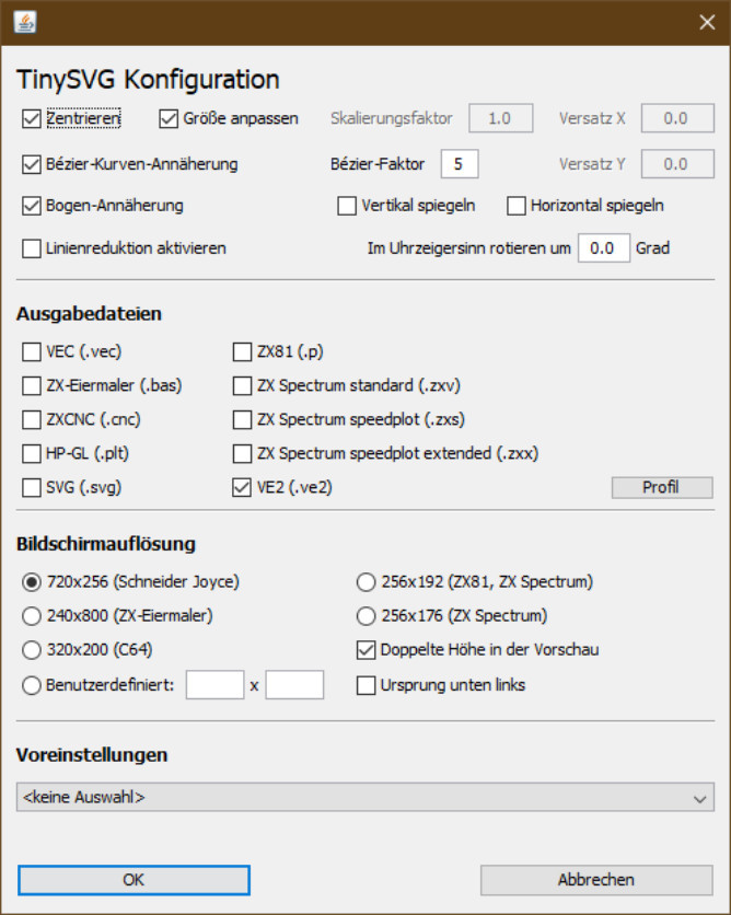 AusgabedateienUnter Ausgabedateien kann man wählen, welche Vektordateien TinySVG erzeugen soll. Für die Schneider Joyce sollte VE2 (.ve2) aktiviert sein; das ältere Format VEC (.vec) kann zwar auch verwendet werden, ist aber nicht mehr zu empfehlen. Das Programm vecread (Beschreibung siehe unten) kann beide Formate (.vec und .ve2) verarbeiten. Alternativ können auch Dateien im HP-GL-Format ausgegeben werden: HP-GL (.plt). Für die Anzeige der PLT-Dateien auf der Joyce steht der HP-GL Interpreter zur Verfügung.