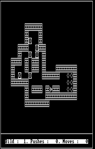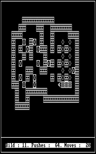 SOKOBANAls (bisher) letzter Versuch einer De-Kompilation habe ich das Spiel SOKOBAN verwendet. Gefunden habe ich es im "Software-Archiv des KC-Clubs",in der Rubrik "CP/M-Spiele". Auch dieses Spiel war in TURBO PASCAL 3.x als .COM-Datei kompiliert. Für die De-Kompilation gilt, was unter QUATRIS beschrieben wurde. Hier zunächst das Ergebnis des Originals mit den speziellen ESCape Sequenzen für den KC. Das größte Problem war die Anpassung an die Grafik-Routinen. Hier habe ich zurückgegriffen auf Routinen, die im Artikel Turbo-Grafik für den JOYCE des DMV-Sonderheft 2/87 vorgestellt wurde. Hier dann das Ergebnis, zerlegt in drei Dateien: