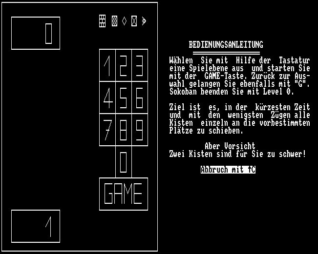 Ein Tipp für die, die selber kompilieren wollen: Es muss eine .COM-Datei erzeugt werden. Wegen der Adresse von _PLOT $F400) muss die Endadresse auf maximal $F3FF eingestellt werden. Ein letzter Hinweis: Zum Aufbau des Spielfeldes werden normale Textdateien verwendet, in denen jeweils fünf Spielfelder enthalten sind. Bei Auswahl einer Spielebene wird eine dieser Dateien eingelesen und in ein internes Spielfeld gewandelt. Die Dateien haben Namen SOKO-x.PIC, wobei x von 0 bis 11 laufen kann ( [0] [1] [2] [3] [4] [5] [6] [7] [8] [9] [10] [11] ). Eine Information zum Spiel SOKOBAN findet sich in Wikipedia, der freien Enzyklopädie. Zum Einstimmen hier der Eröffnungsbildschirm und zwei mögliche Spielfelder:
